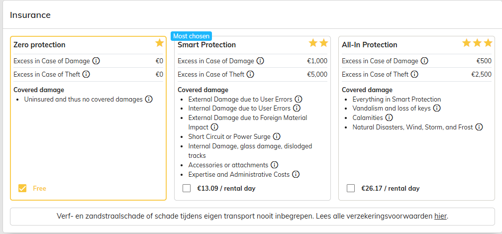 With Basic Protection, you pay nothing, just like before, and common types of damage are covered. With Smart and All-In, an increasing number of situations is insured, and your deductible is also reduced. You pay a fixed price per rental day, depending on the initial rental price of the device.